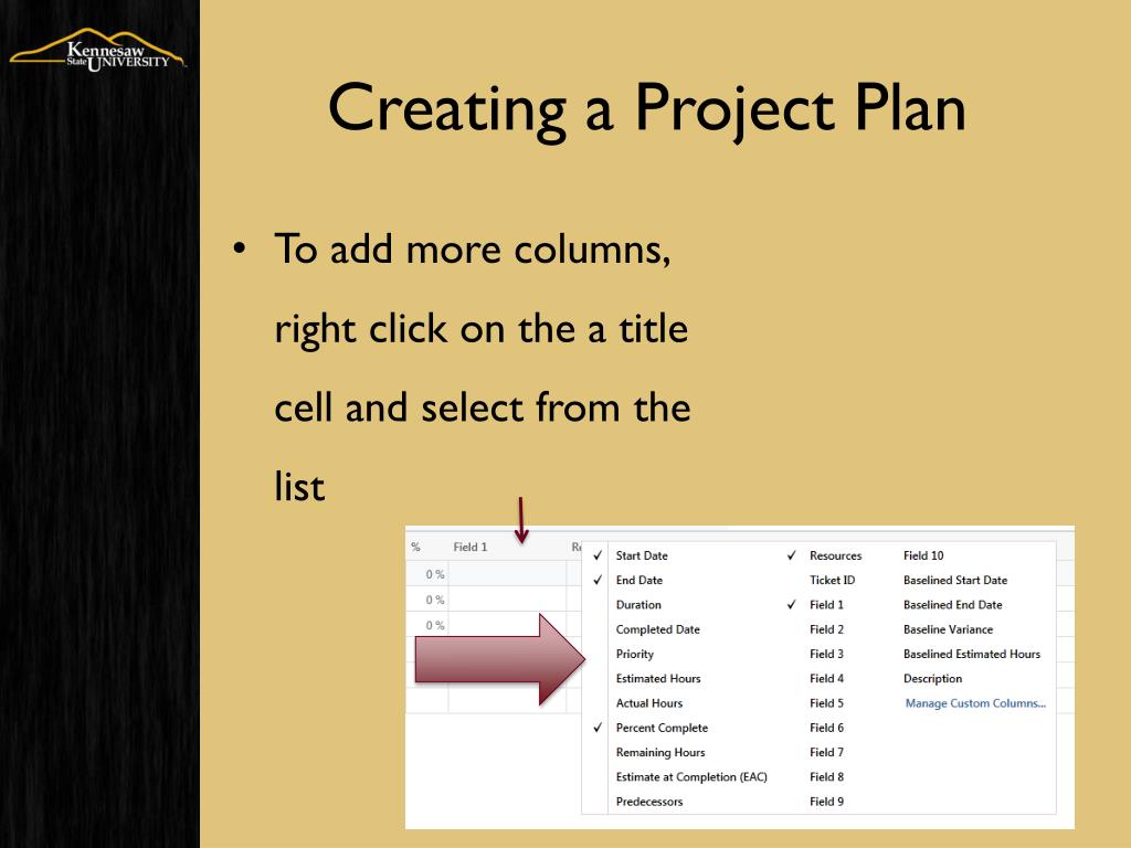 Creating a Project Plan • To add more columns, right click on the a titlecell and select from thelist