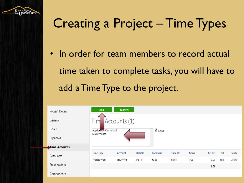Creating a Project– Time Types • In order for team members to record actual time taken to complete tasks, you will have to add a Time Type to the project.