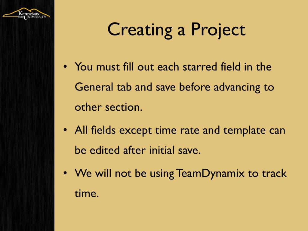 Creating a Project • You must fill out each starred field in the General tab and save before advancing to other section. • All fields except time rate and template can be edited after initial save. • We will not be using TeamDynamix to track time.
