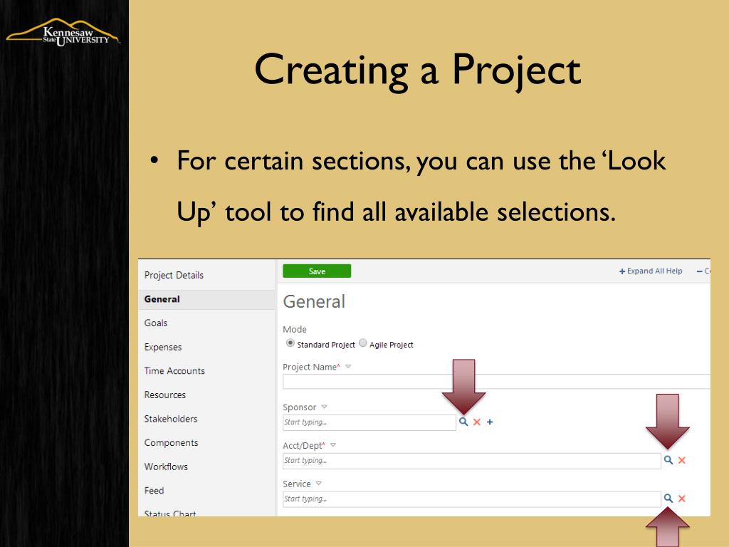 Creating a Project • For certain sections, you can use the ‘Look Up’ tool to find all available selections.