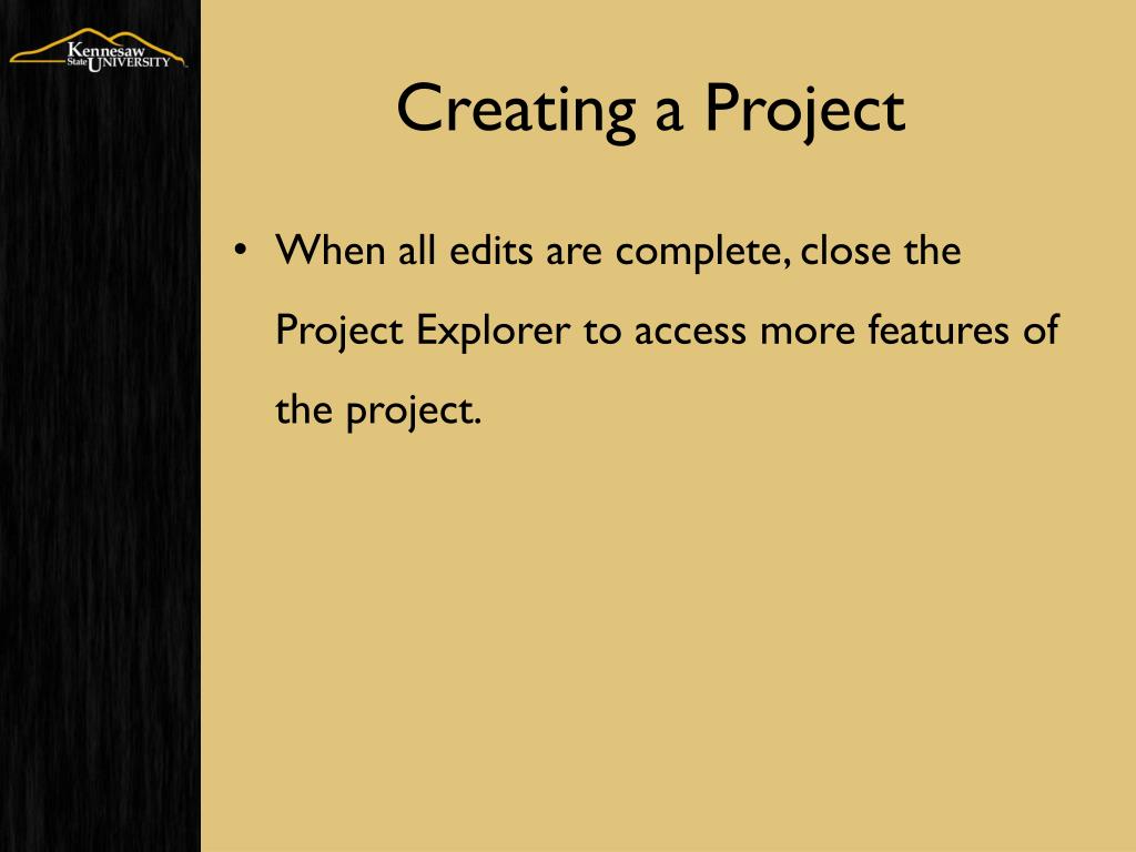 Creating a Project • When all edits are complete, close the Project Explorer to access more features of the project.