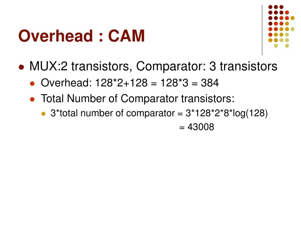 Overhead : CAM • MUX:2 transistors, Comparator: 3 transistors • Overhead: 128*2+128 = 128*3 = 384 • Total Number of Comparator transistors: • 3*total number of comparator = 3*128*2*8*log(128) = 43008
