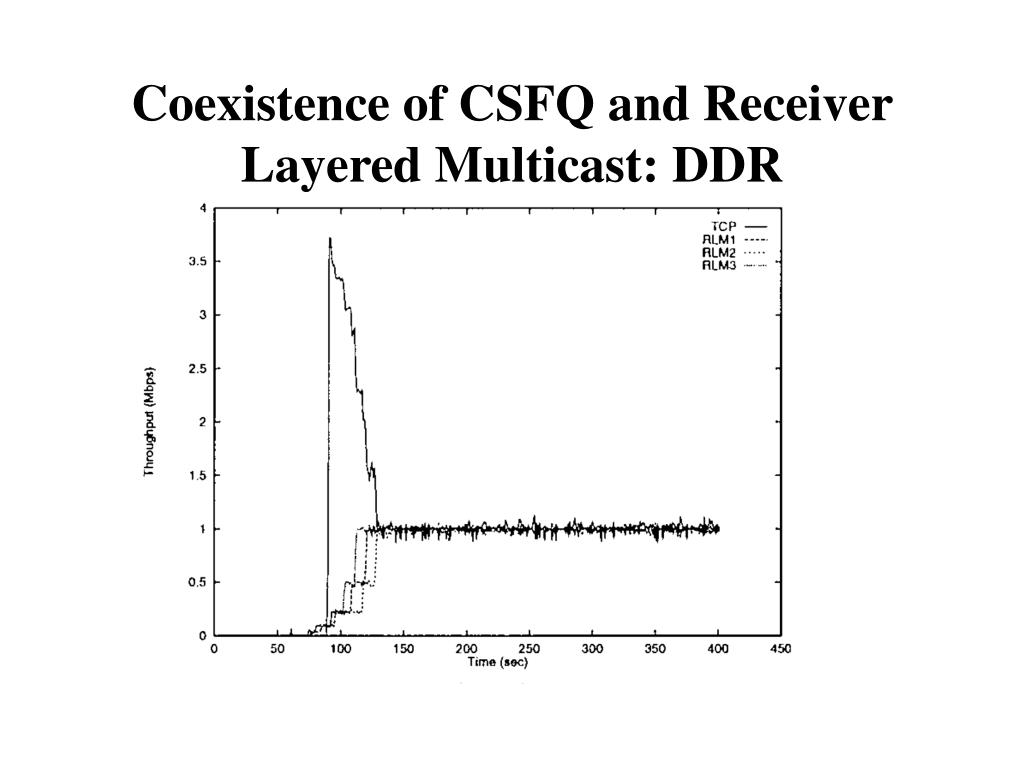 More details.. • Occasionally, router buffer overflows: • then, decrease a(t) by 1% • Never increase a(t) by more than 25% • Link is considered uncongested until occupancy > 50% of buffer capacity • Weighted CSFQ option: if w(i) is the weight of flow i, then: r(i) <= r(i)/w(i)