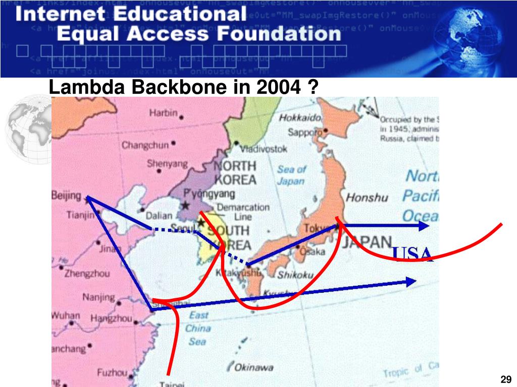 Tyco Telecomm Donation Summary • Colocation space in NYC for Expanded NY Int’l Exchange Pt • Colocation space in Oregon and California on US West Coast • Production R&E Bandwidth: 622 Mbps POS • NY-London-Groningen (Netherlands) • Connects to IEEAF fiber to Amsterdam and Hamburg • CA-OR-Tokyo, Seoul, Shanghai, Taipei, Hong Kong, and Singapore • “International Lambda”: Research 10 Gbps optical wavelength • NY-London-Groningen (Netherlands) • CA-OR-Tokyo, Seoul, Shanghai, Taipei, Hong Kong, and Singapore • 200sq.ft. Co-location space in each of global facilities • Additional donations as global build-out continues
