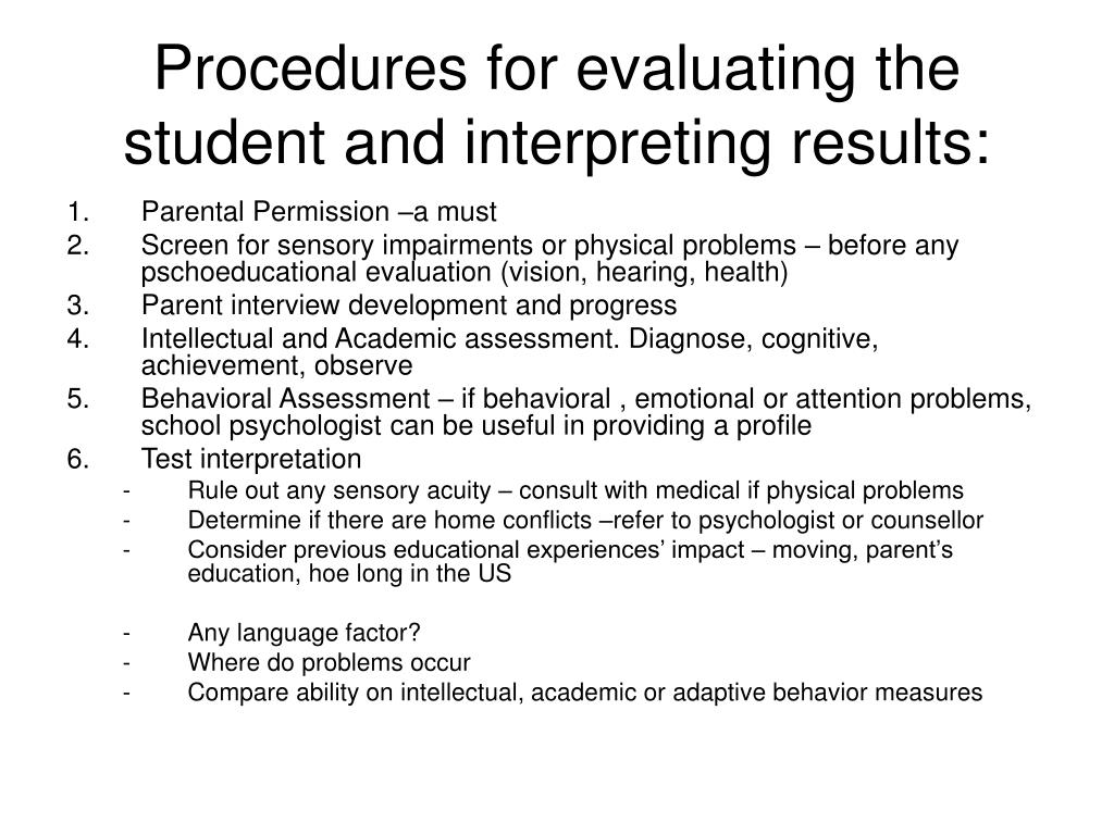 Procedures for evaluating the student and interpreting results: • Parental Permission –a must • Screen for sensory impairments or physical problems – before any pschoeducational evaluation (vision, hearing, health) • Parent interview development and progress • Intellectual and Academic assessment. Diagnose, cognitive, achievement, observe • Behavioral Assessment – if behavioral , emotional or attention problems, school psychologist can be useful in providing a profile • Test interpretation • Rule out any sensory acuity – consult with medical if physical problems • Determine if there are home conflicts –refer to psychologist or counsellor • Consider previous educational experiences’ impact – moving, parent’s education, hoe long in the US • Any language factor? • Where do problems occur • Compare ability on intellectual, academic or adaptive behavior measures