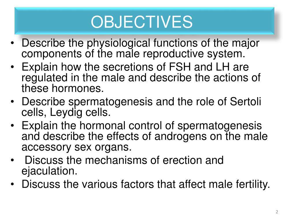 Male R eproductive Physiology . Dr. Amel Eassawi. Objectives. Describe the physiological functions of the major components of the male reproductive system. Explain how the secretions of FSH and LH are regulated in the male and describe the actions of these hormones.
