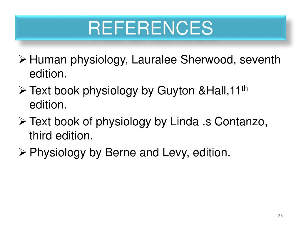 References • Human physiology, Lauralee Sherwood, seventh edition. • Text book physiology by Guyton &Hall,11th edition. • Text book of physiology by Linda .s Contanzo, third edition. • Physiology by Berne and Levy, edition.