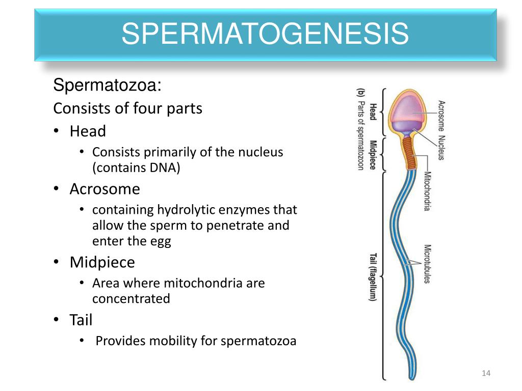 Spermatogenesis Spermatozoa: Consists of four parts • Head • Consists primarily of the nucleus (contains DNA) • Acrosome • containing hydrolytic enzymes that allow the sperm to penetrate and enter the egg • Midpiece • Area where mitochondria are concentrated • Tail • Provides mobility for spermatozoa