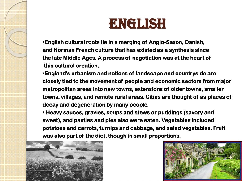 English •English cultural roots lie in a merging of Anglo-Saxon, Danish, and Norman French culture that has existed as a synthesis since the late Middle Ages. A process of negotiation was at the heart of this cultural creation. •England's urbanism and notions of landscape and countryside are closely tied to the movement of people and economic sectors from major metropolitan areas into new towns, extensions of older towns, smaller towns, villages, and remote rural areas. Cities are thought of as places of decay and degeneration by many people. • Heavy sauces, gravies, soups and stews or puddings (savory and sweet), and pasties and pies also were eaten. Vegetables included potatoes and carrots, turnips and cabbage, and salad vegetables. Fruit was also part of the diet, though in small proportions.
