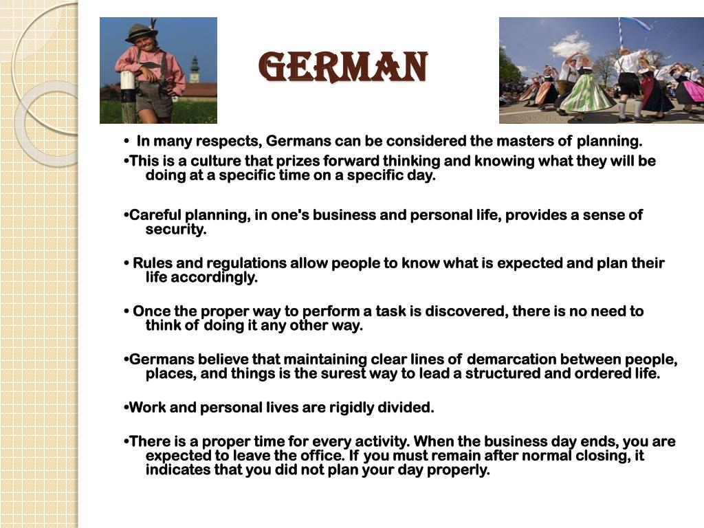 German • In many respects, Germans can be considered the masters of planning. •This is a culture that prizes forward thinking and knowing what they will be doing at a specific time on a specific day. •Careful planning, in one's business and personal life, provides a sense of security. • Rules and regulations allow people to know what is expected and plan their life accordingly. • Once the proper way to perform a task is discovered, there is no need to think of doing it any other way. •Germans believe that maintaining clear lines of demarcation between people, places, and things is the surest way to lead a structured and ordered life. •Work and personal lives are rigidly divided. •There is a proper time for every activity. When the business day ends, you are expected to leave the office. If you must remain after normal closing, it indicates that you did not plan your day properly.