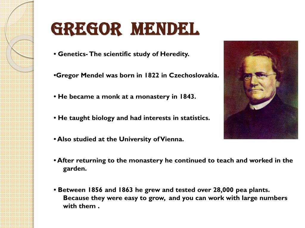 Gregor Mendel • Genetics- The scientific study of Heredity. •Gregor Mendel was born in 1822 in Czechoslovakia. • He became a monk at a monastery in 1843. • He taught biology and had interests in statistics. • Also studied at the University of Vienna. • After returning to the monastery he continued to teach and worked in the garden. • Between 1856 and 1863 he grew and tested over 28,000 pea plants. Because they were easy to grow, and you can work with large numbers with them .
