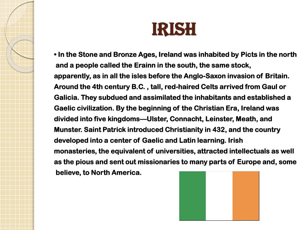 Irish • In the Stone and Bronze Ages, Ireland was inhabited by Picts in the north and a people called the Erainn in the south, the same stock, apparently, as in all the isles before the Anglo-Saxon invasion of Britain. Around the 4th century B.C. , tall, red-haired Celts arrived from Gaul or Galicia. They subdued and assimilated the inhabitants and established a Gaelic civilization. By the beginning of the Christian Era, Ireland was divided into five kingdoms—Ulster, Connacht, Leinster, Meath, and Munster. Saint Patrick introduced Christianity in 432, and the country developed into a center of Gaelic and Latin learning. Irish monasteries, the equivalent of universities, attracted intellectuals as well as the pious and sent out missionaries to many parts of Europe and, some believe, to North America.