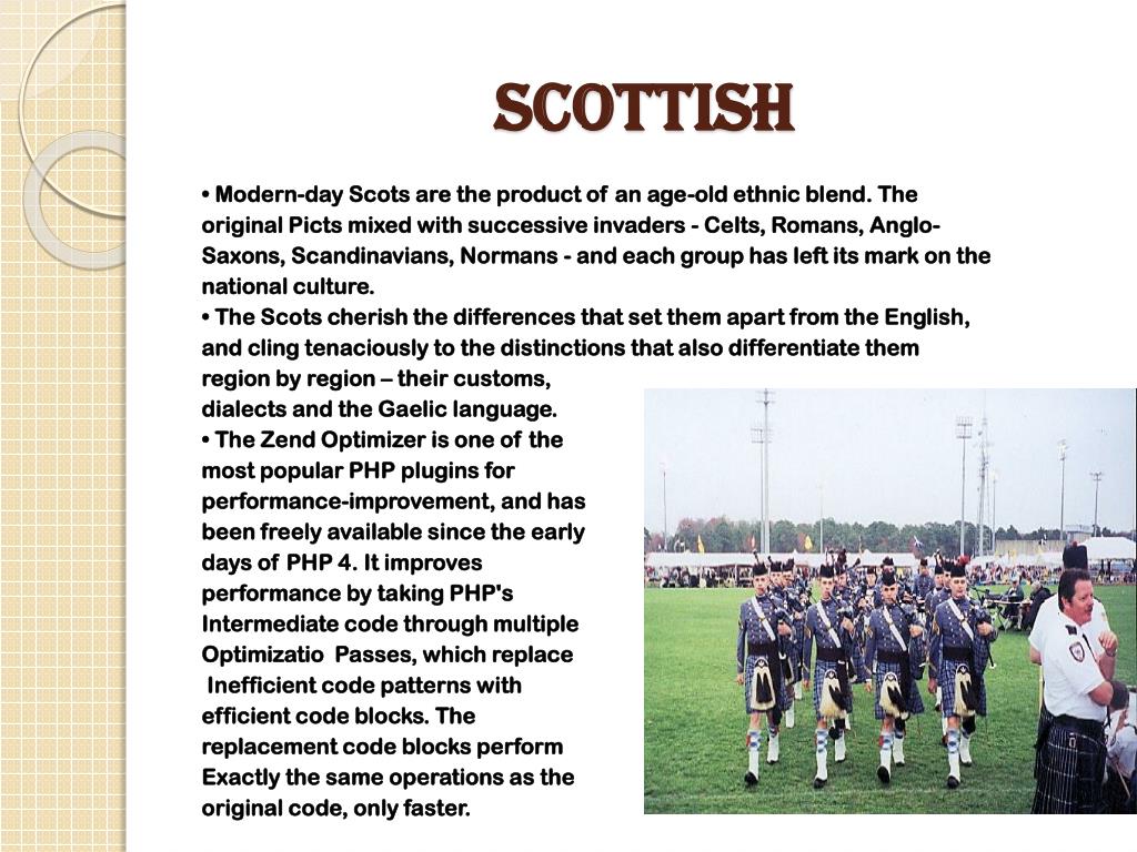 Scottish • Modern-day Scots are the product of an age-old ethnic blend. The original Picts mixed with successive invaders - Celts, Romans, Anglo- Saxons, Scandinavians, Normans - and each group has left its mark on the national culture. • The Scots cherish the differences that set them apart from the English, and cling tenaciously to the distinctions that also differentiate them region by region – their customs, dialects and the Gaelic language. • The Zend Optimizer is one of the most popular PHP plugins for performance-improvement, and has been freely available since the early days of PHP 4. It improves performance by taking PHP's Intermediate code through multiple Optimizatio Passes, which replace Inefficient code patterns with efficient code blocks. The replacement code blocks perform Exactly the same operations as the original code, only faster.