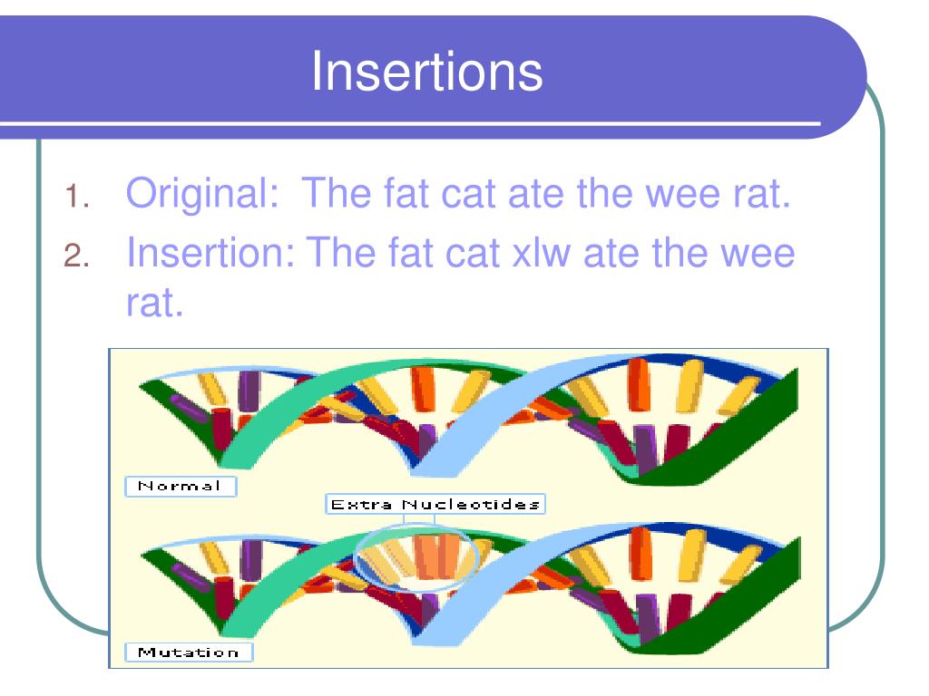 Point mutations • Original: The fat cat ate the wee rat. • Point Mutation: The fat hat ate the wee rat (changing the r in cat to the h in hat). • This change alters the meaning of the instructions significantly. In DNA, switching one base in the DNA sequence to a different base canchange the protein that the gene makes.