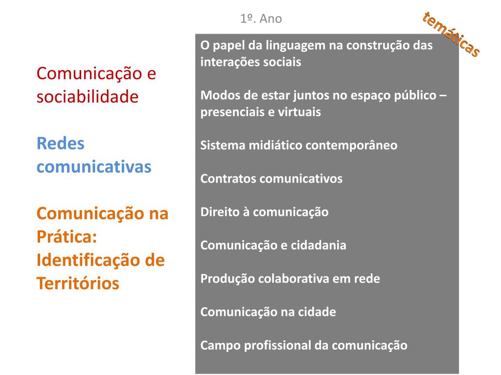 temáticas O papel da linguagem na construção das interações sociais Modos de estar juntos no espaço público – presenciais e virtuais Sistema midiático contemporâneo Contratos comunicativos Direito à comunicação Comunicação e cidadania Produção colaborativa em rede Comunicação na cidade Campo profissional da comunicação Comunicação e sociabilidade Redes comunicativas Comunicação na Prática: Identificação de Territórios 1º. Ano