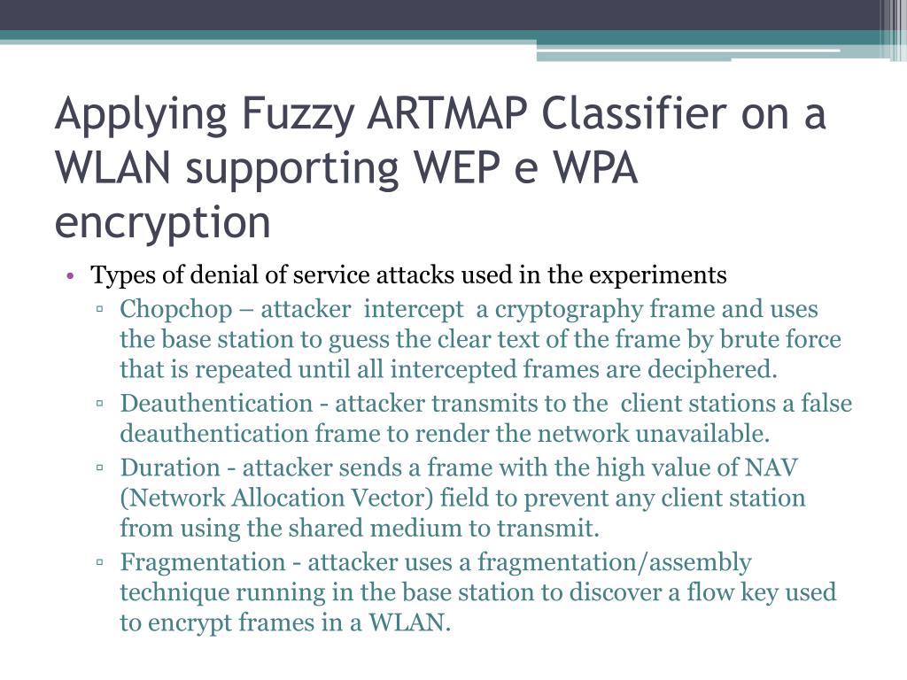 Applying Fuzzy ARTMAP Classifier on a WLAN supporting WEP e WPA encryption • Types of denial of service attacks used in the experiments • Chopchop – attacker intercept a cryptography frame and uses the base station to guess the clear text of the frame by brute force that is repeated until all intercepted frames are deciphered. • Deauthentication - attacker transmits to the client stations a false deauthentication frame to render the network unavailable. • Duration - attacker sends a frame with the high value of NAV (Network Allocation Vector) field to prevent any client station from using the shared medium to transmit. • Fragmentation - attacker uses a fragmentation/assembly technique running in the base station to discover a flow key used to encrypt frames in a WLAN.