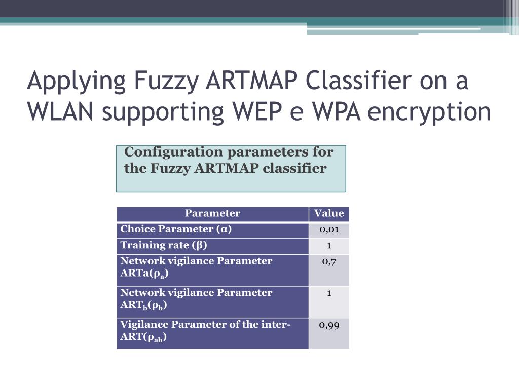 Applying Fuzzy ARTMAP Classifier on a WLAN supporting WEP e WPA encryption Configuration parameters for the Fuzzy ARTMAP classifier