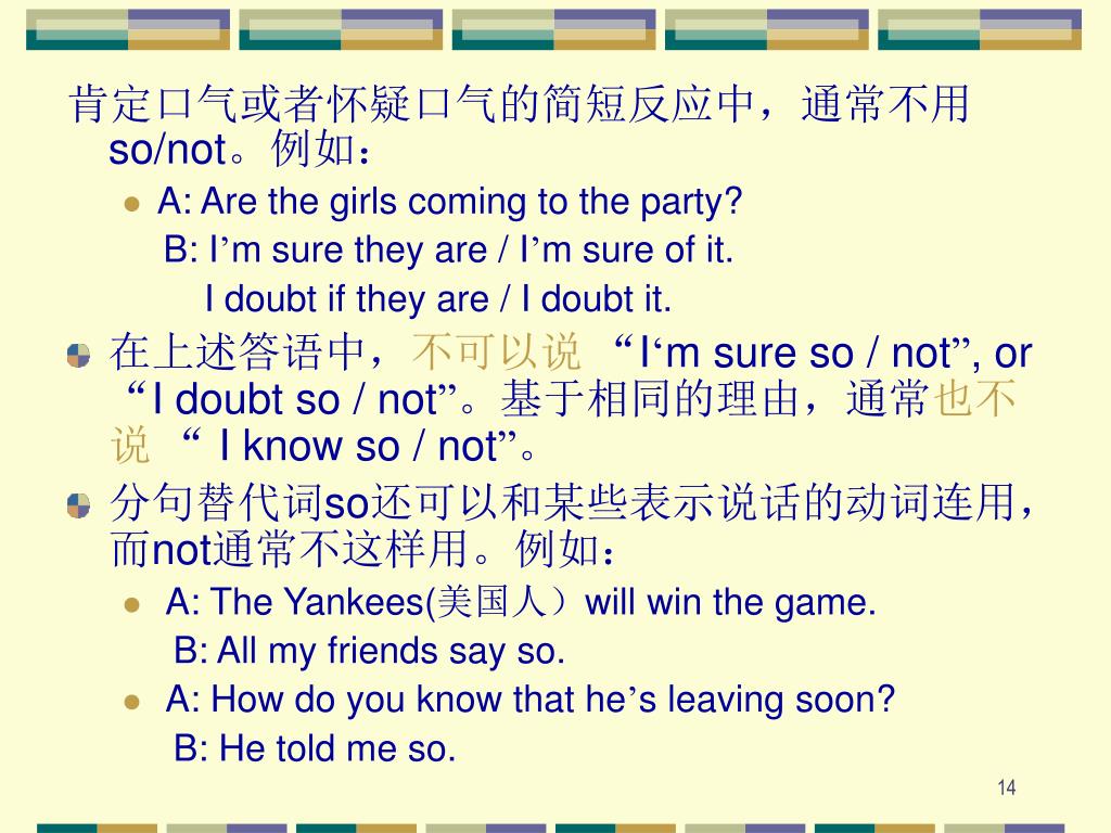 肯定口气或者怀疑口气的简短反应中,通常不用so/not。例如:肯定口气或者怀疑口气的简短反应中,通常不用so/not。例如: • A: Are the girls coming to the party? B: I’m sure they are / I’m sure of it. I doubt if they are / I doubt it. • 在上述答语中,不可以说“I‘m sure so / not”, or“I doubt so / not”。基于相同的理由,通常也不说“I know so / not”。 • 分句替代词so还可以和某些表示说话的动词连用,而not通常不这样用。例如: • A: The Yankees(美国人)will win the game. B: All my friends say so. • A: How do you know that he’s leaving soon? B: He told me so.