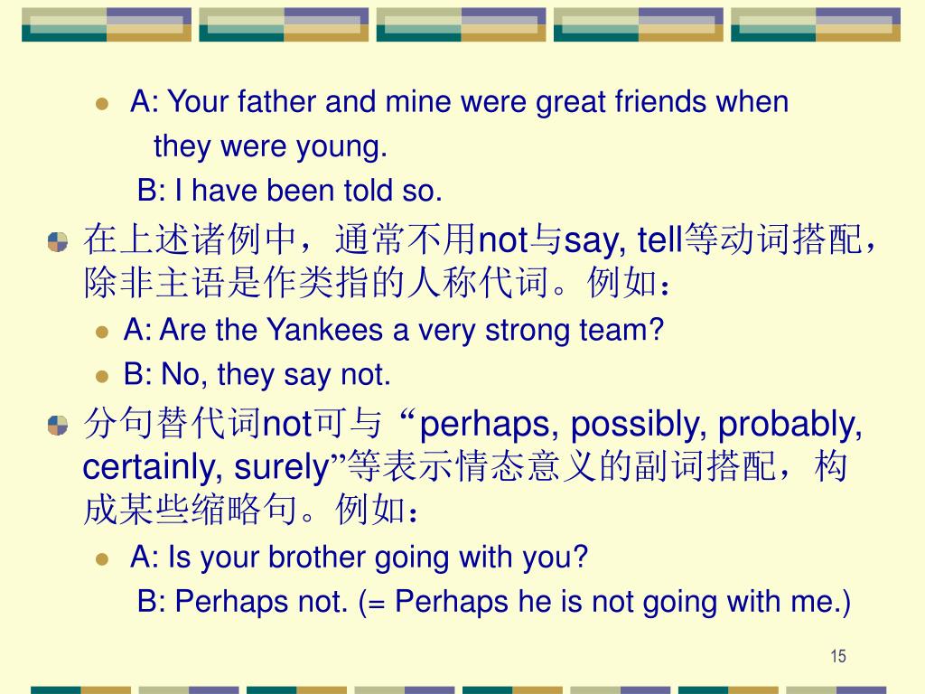 A: Your father and mine were great friends when they were young. B: I have been told so. • 在上述诸例中,通常不用not与say, tell等动词搭配,除非主语是作类指的人称代词。例如: • A: Are the Yankees a very strong team? • B: No, they say not. • 分句替代词not可与“perhaps, possibly, probably, certainly, surely”等表示情态意义的副词搭配,构成某些缩略句。例如: • A: Is your brother going with you? B: Perhaps not. (= Perhaps he is not going with me.)