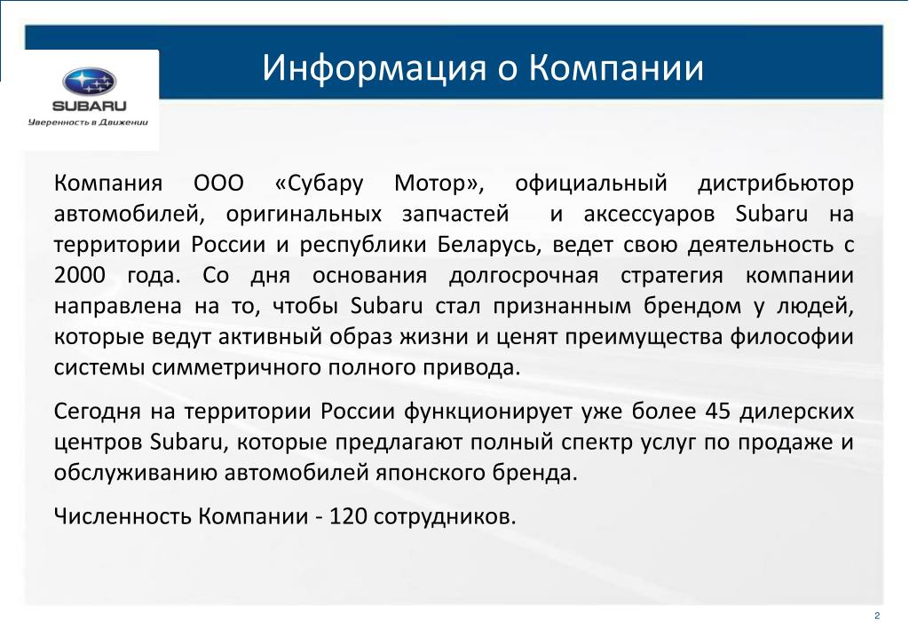 Информация о Компании Компания ООО «Субару Мотор», официальный дистрибьютор автомобилей, оригинальных запчастей и аксессуаров Subaru на территории России и республики Беларусь, ведет свою деятельность с 2000 года. Со дня основания долгосрочная стратегия компании направлена на то, чтобы Subaru стал признанным брендом у людей, которые ведут активный образ жизни и ценят преимущества философии системы симметричного полного привода. Сегодня на территории России функционирует уже более 45 дилерских центров Subaru, которые предлагают полный спектр услуг по продаже и обслуживанию автомобилей японского бренда. Численность Компании - 120 сотрудников. 2