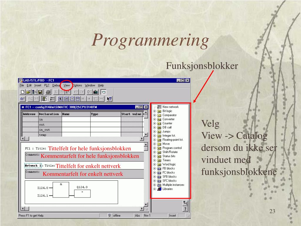 Programmering Funksjonsblokker Velg View -> Catalog dersom du ikke ser vinduet med funksjonsblokkene Tittelfelt for hele funksjonsblokken Kommentarfelt for hele funksjonsblokken Tittelfelt for enkelt nettverk Kommentarfelt for enkelt nettverk