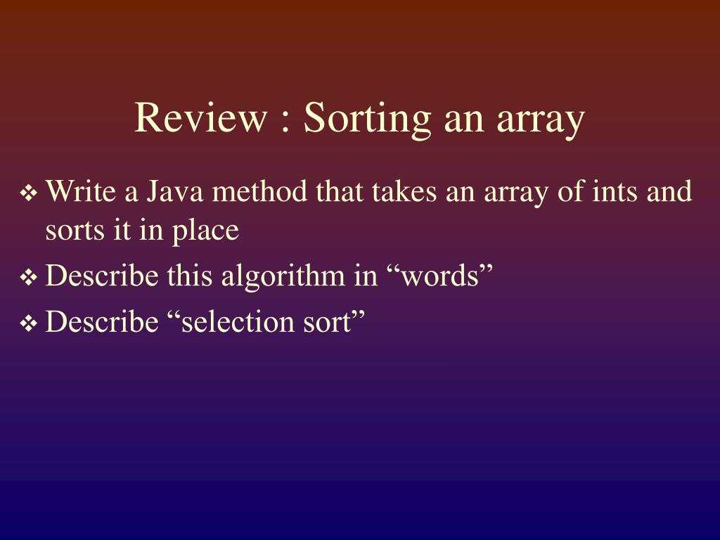 Review : Sorting an array • Write a Java method that takes an array of ints and sorts it in place • Describe this algorithm in “words” • Describe “selection sort”