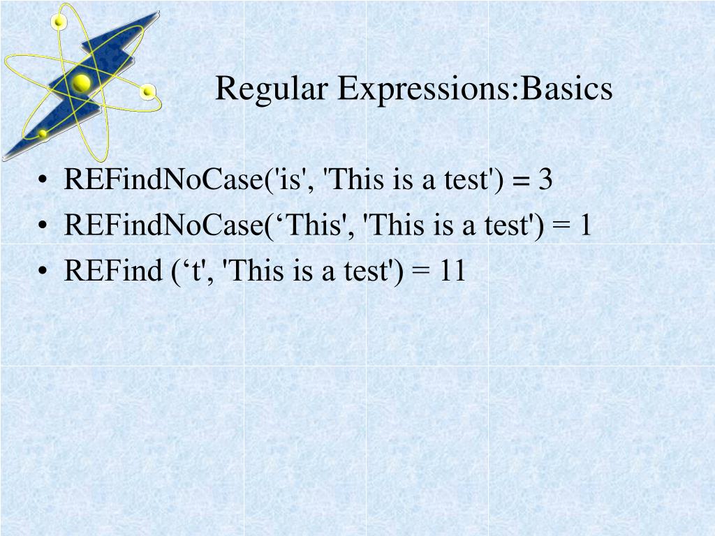 Regular Expressions:Basics • REFindNoCase('is', 'This is a test') = 3 • REFindNoCase(‘This', 'This is a test') = 1 • REFind (‘t', 'This is a test') = 11