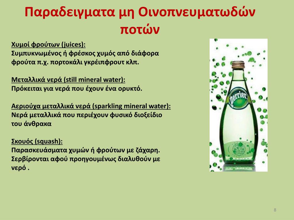 Παραδειγματα μη Οινοπνευματωδών ποτών Χυμοί φρούτων (juices): Συμπυκνωμένος ή φρέσκος χυμός από διάφορα φρούτα π.χ. πορτοκάλι γκρέιπφρουτ κλπ. Μεταλλικά νερά (still mineral water): Πρόκειται για νερά που έχουν ένα ορυκτό. Αεριούχα μεταλλικά νερά (sparkling mineral water): Νερά μεταλλικά που περιέχουν φυσικό διοξείδιο του άνθρακα Σκουός (squash): Παρασκευάσματα χυμών ή φρούτων με ζάχαρη. Σερβίρονται αφού προηγουμένως διαλυθούν με νερό .