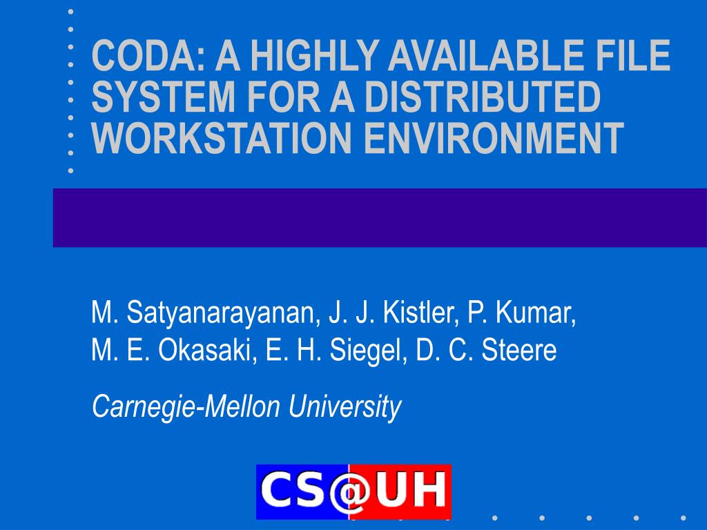 CODA: A HIGHLY AVAILABLE FILE SYSTEM FOR A DISTRIBUTED WORKSTATION ENVIRONMENT M. Satyanarayanan, J. J. Kistler, P. Kumar,M. E. Okasaki, E. H. Siegel, D. C. Steere Carnegie-Mellon University