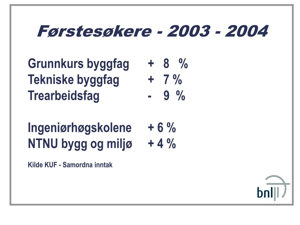 Førstesøkere - 2003 - 2004 Grunnkurs byggfag + 8 % Tekniske byggfag + 7 % Trearbeidsfag - 9 % Ingeniørhøgskolene + 6 % NTNU bygg og miljø + 4 % Kilde KUF - Samordna inntak