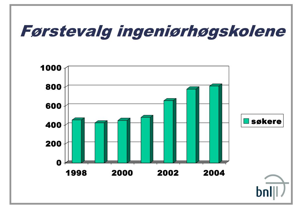 BNLs måldokument for utdanningspolitikk • Rekrutteringsbehovet er; • 6600 elever i videregående skoles byggorienterte studieretninger • 300 studenter i Teknisk fagskole • 500 studenter i ingeniørhøgskolene • 400 studenter i sivilingeniørstudiet (inkludert landbrukshøgskolenstrefag) • Antallet kvinnelige søkere til studieplassene bør prosentuelt øke sterkere enn økningen i mannlige søkere for å oppnå en bedre fordeling mellom kjønnene i næringen . • Byggenæringens rekrutteringsarbeid tar sikte på at denne utdanningskapasiteten skal fylles med utdanningssøkere som er motiverte for arbeid i næringen og kvalifiserte til å fullføre utdanningen.