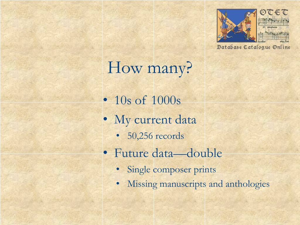 How many? • 10s of 1000s • My current data • 50,256 records • Future data—double • Single composer prints • Missing manuscripts and anthologies