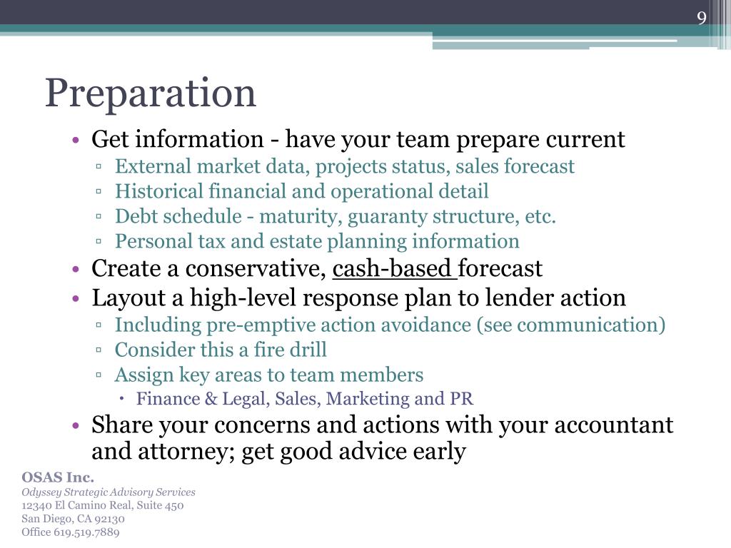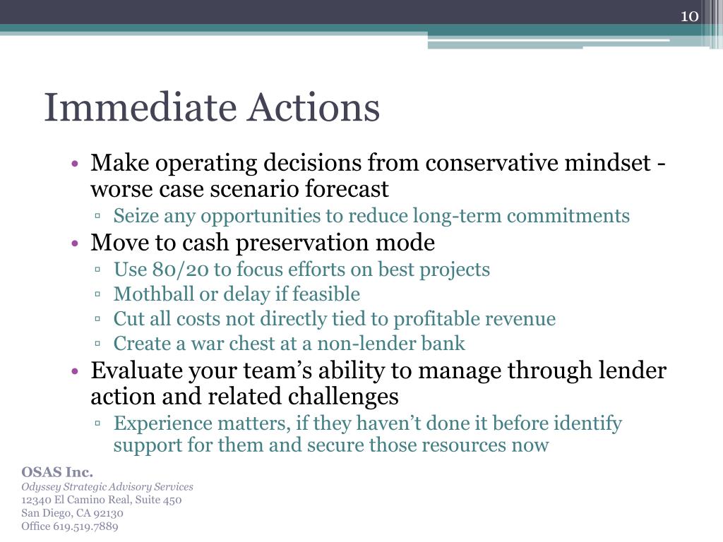 Surviving Lender Action Pacific Coast Builders Conference . June 2010. OSAS Inc. Odyssey Strategic Advisory Services 12340 El Camino Real, Suite 250 San Diego, CA 92130 Office 619 -519-7889. Anticipation & Preparation. Warning Signs of Impending Bank Action How to prepare