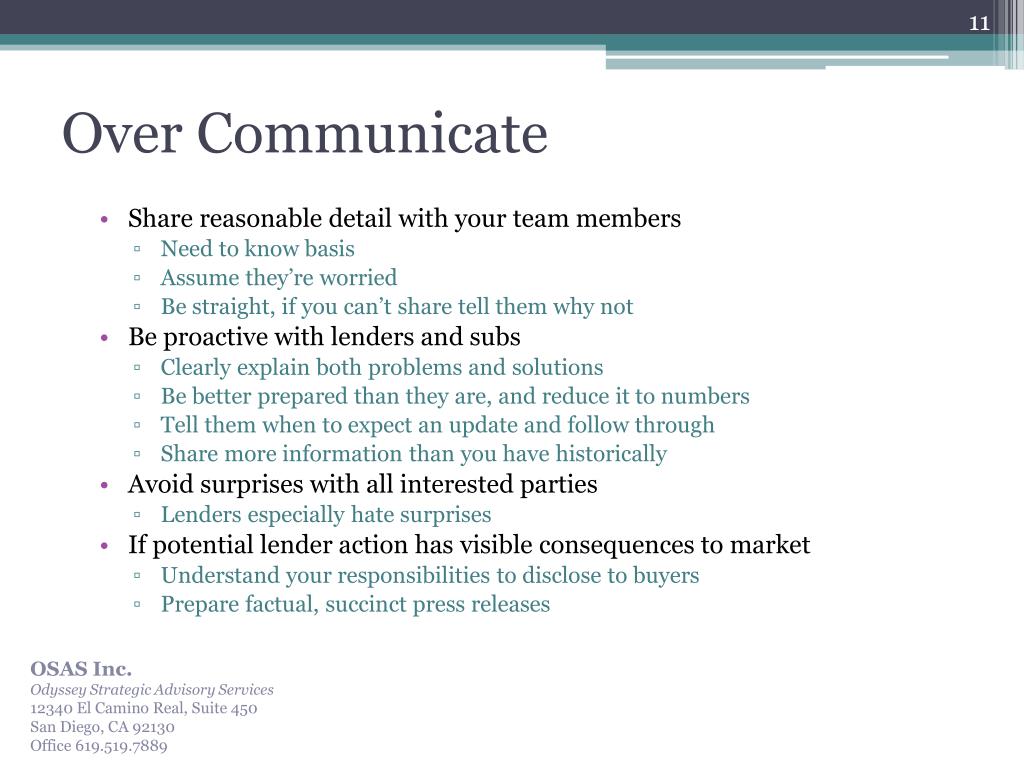 Over Communicate • Share reasonable detail with your team members • Need to know basis • Assume they’re worried • Be straight, if you can’t share tell them why not • Be proactive with lenders and subs • Clearly explain both problems and solutions • Be better prepared than they are, and reduce it to numbers • Tell them when to expect an update and follow through • Share more information than you have historically • Avoid surprises with all interested parties • Lenders especially hate surprises • If potential lender action has visible consequences to market • Understand your responsibilities to disclose to buyers • Prepare factual, succinct press releases