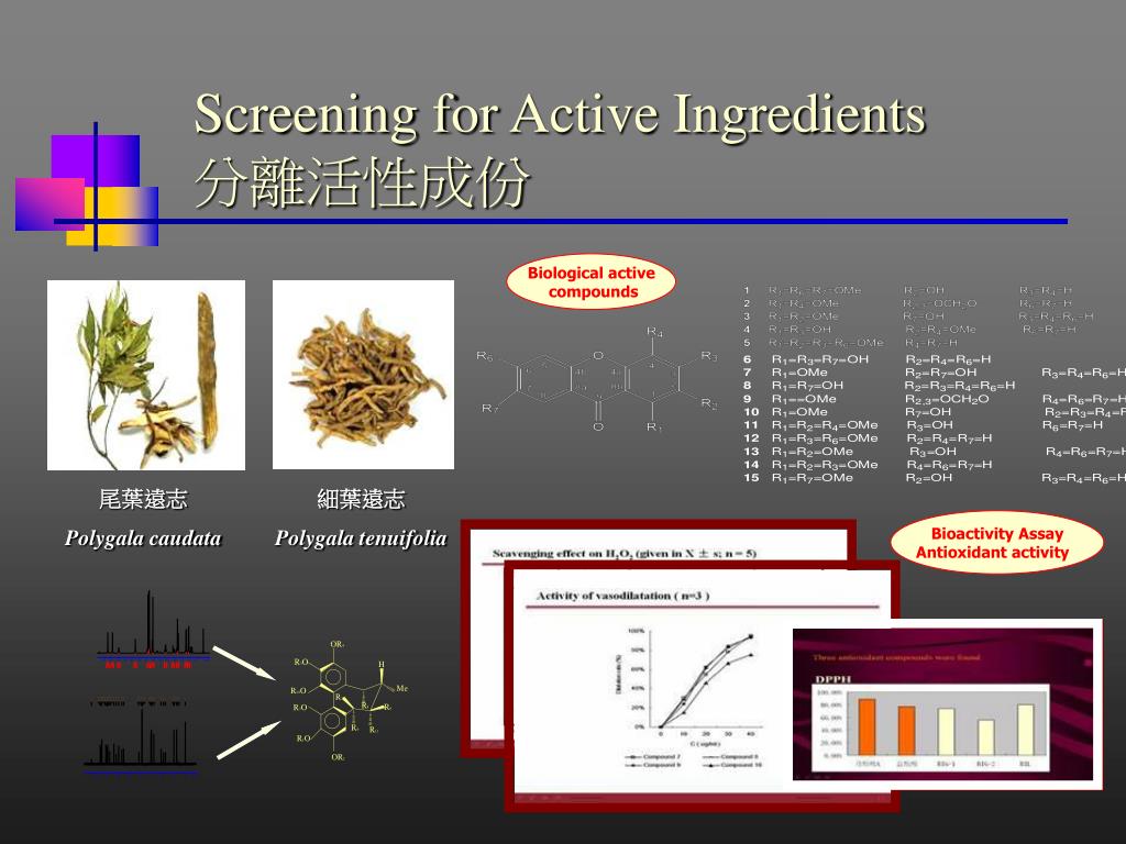 Bioactivity Assay Antioxidant activity Biological active compounds 尾葉遠志 Polygala caudata 細葉遠志 Polygala tenuifolia Screeningfor Active Ingredients 分離活性成份