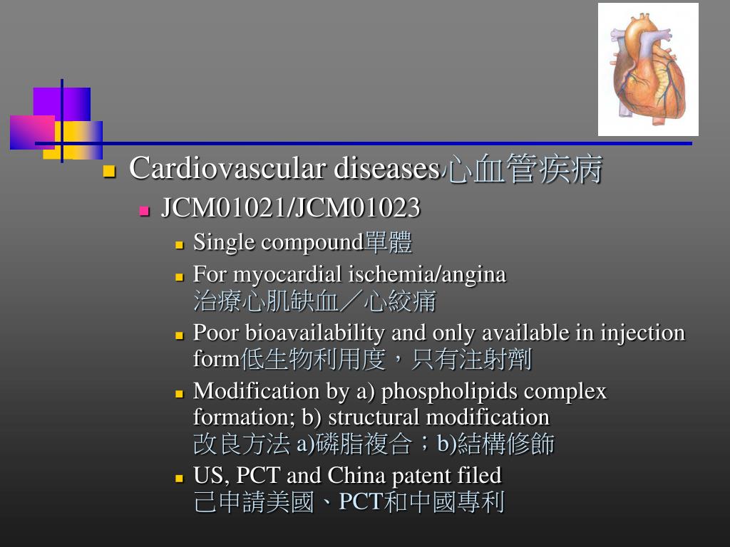 Cardiovascular diseases心血管疾病 • JCM01021/JCM01023 • Single compound單體 • For myocardial ischemia/angina治療心肌缺血/心絞痛 • Poor bioavailability and only available in injection form低生物利用度,只有注射劑 • Modification by a) phospholipids complex formation; b) structural modification改良方法a)磷脂複合;b)結構修飾 • US, PCT and China patent filed己申請美國、PCT和中國專利