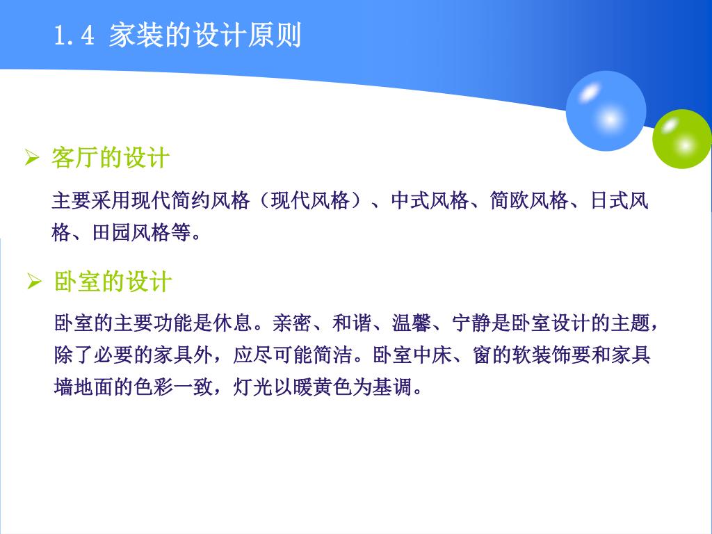 1.4 家装的设计原则 • 客厅的设计 主要采用现代简约风格(现代风格)、中式风格、简欧风格、日式风格、田园风格等。 • 卧室的设计 卧室的主要功能是休息。亲密、和谐、温馨、宁静是卧室设计的主题,除了必要的家具外,应尽可能简洁。卧室中床、窗的软装饰要和家具墙地面的色彩一致,灯光以暖黄色为基调。