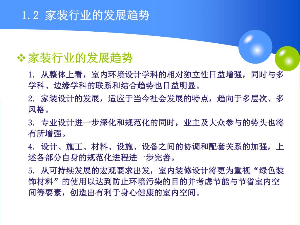 家装行业的发展趋势 1. 从整体上看,室内环境设计学科的相对独立性日益增强,同时与多学科、边缘学科的联系和结合趋势也日益明显。 2. 家装设计的发展,适应于当今社会发展的特点,趋向于多层次、多风格。 3. 专业设计进一步深化和规范化的同时,业主及大众参与的势头也将有所增强。 4. 设计、施工、材料、设施、设备之间的协调和配套关系的加强,上述各部分自身的规范化进程进一步完善。 5. 从可持续发展的宏观要求出发,室内装修设计将更为重视“绿色装饰材料”的使用以达到防止环境污染的目的并考虑节能与节省室内空间等要素,创造出有利于身心健康的室内空间。 1.2 家装行业的发展趋势