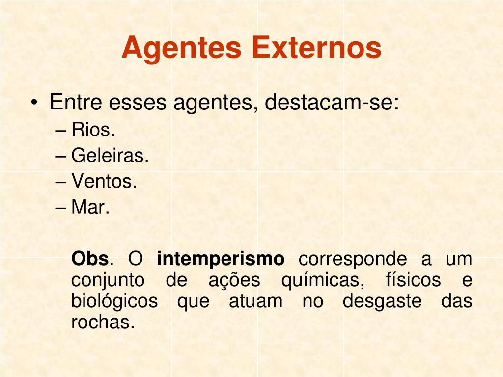 Agentes Externos • Entre esses agentes, destacam-se: • Rios. • Geleiras. • Ventos. • Mar. Obs. O intemperismo corresponde a um conjunto de ações químicas, físicos e biológicos que atuam no desgaste das rochas.