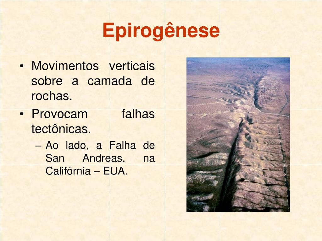 Movimentos verticais sobre a camada de rochas. Provocam falhas tectônicas. Ao lado, a Falha de San Andreas, na Califórnia – EUA. Epirogênese