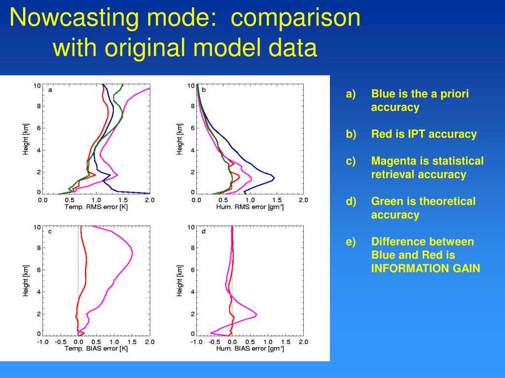 Nowcasting mode: comparison with original model data • Blue is the a priori accuracy • Red is IPT accuracy • Magenta is statistical retrieval accuracy • Green is theoretical accuracy • Difference between Blue and Red is INFORMATION GAIN EGU-Boers (2006)