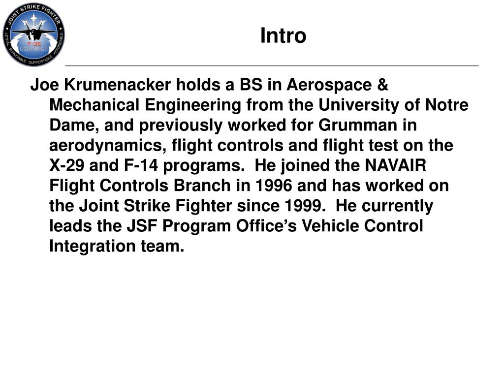 Intro Joe Krumenacker holds a BS in Aerospace & Mechanical Engineering from the University of Notre Dame, and previously worked for Grumman in aerodynamics, flight controls and flight test on the X-29 and F-14 programs. He joined the NAVAIR Flight Controls Branch in 1996 and has worked on the Joint Strike Fighter since 1999. He currently leads the JSF Program Office’s Vehicle Control Integration team.