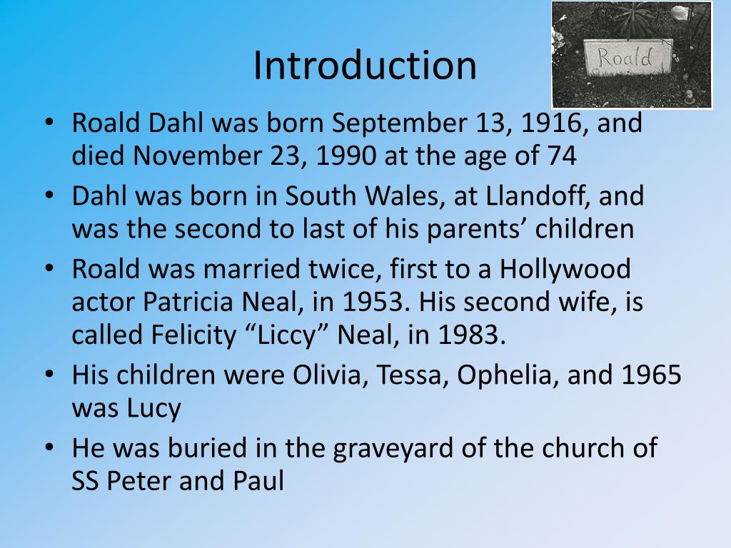 Introduction • Roald Dahl was born September 13, 1916, and died November 23, 1990 at the age of 74 • Dahl was born in South Wales, at Llandoff, and was the second to last of his parents’ children • Roald was married twice, first to a Hollywood actor Patricia Neal, in 1953. His second wife, is called Felicity “Liccy” Neal, in 1983. • His children were Olivia, Tessa, Ophelia, and 1965 was Lucy • He was buried in the graveyard of the church of SS Peter and Paul