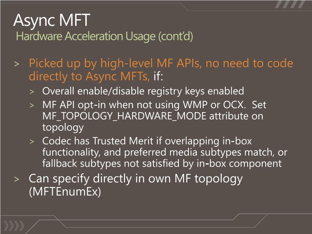 Async MFTHardware Acceleration Usage (cont’d) • Picked up by high-level MF APIs, no need to code directly to Async MFTs, if: • Overall enable/disable registry keys enabled • MF API opt-in when not using WMP or OCX. Set MF_TOPOLOGY_HARDWARE_MODE attribute on topology • Codec has Trusted Merit if overlapping in-box functionality, and preferred media subtypes match, or fallback subtypes not satisfied by in-box component • Can specify directly in own MF topology (MFTEnumEx)
