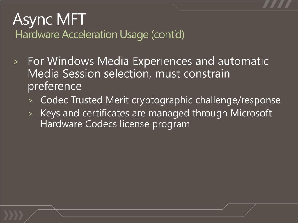 Async MFTHardware Acceleration Usage (cont’d) • For Windows Media Experiences and automatic Media Session selection, must constrain preference • Codec Trusted Merit cryptographic challenge/response • Keys and certificates are managed through Microsoft Hardware Codecs license program