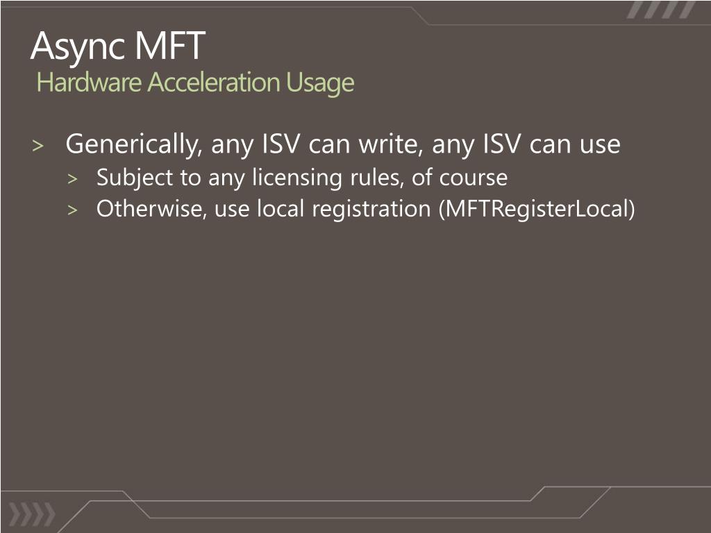 Async MFTHardware Acceleration Usage • Generically, any ISV can write, any ISV can use • Subject to any licensing rules, of course • Otherwise, use local registration (MFTRegisterLocal)