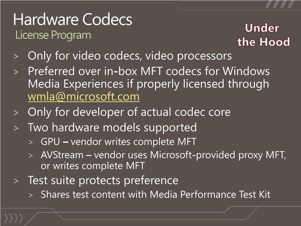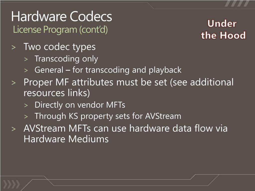 Hardware CodecsLicense Program (cont’d) Under the Hood • Two codec types • Transcoding only • General – for transcoding and playback • Proper MF attributes must be set (see additional resources links) • Directly on vendor MFTs • Through KS property sets for AVStream • AVStream MFTs can use hardware data flow via Hardware Mediums