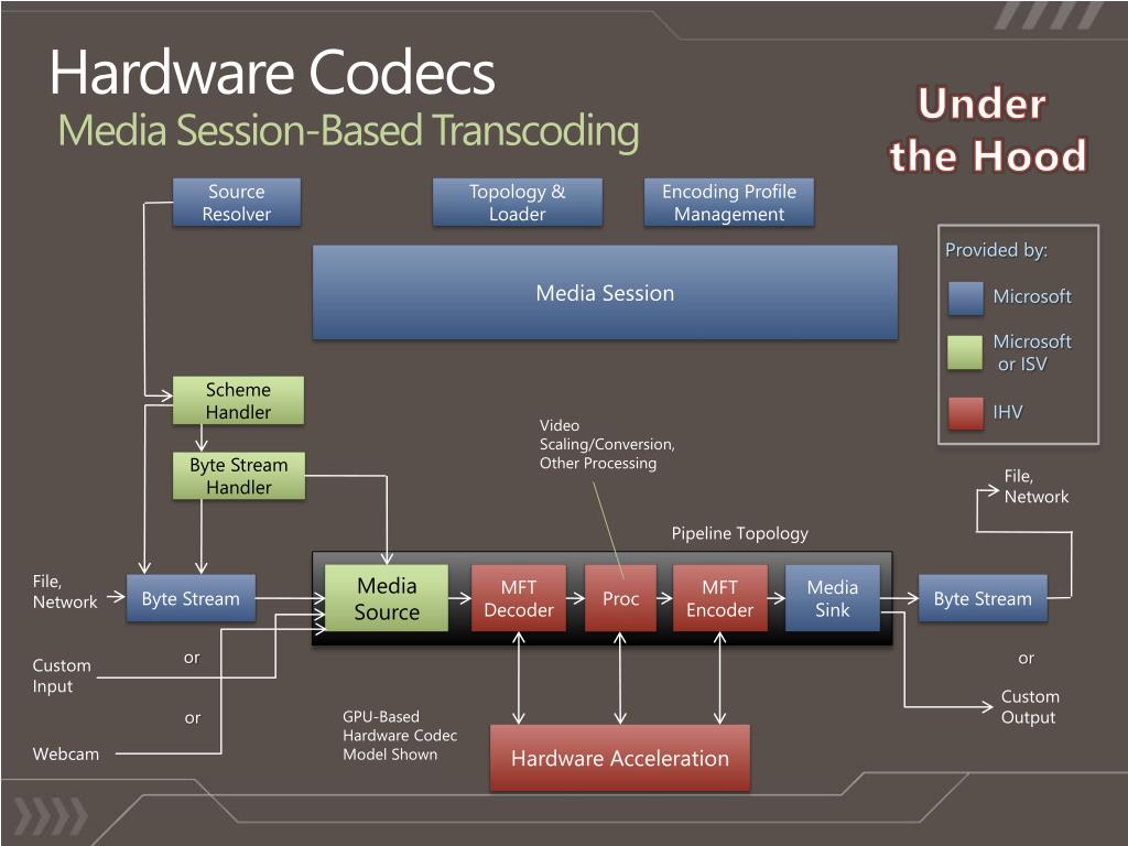 Hardware CodecsMedia Session-Based Transcoding Under the Hood Source Resolver Topology & Loader Encoding Profile Management Provided by: Media Session Microsoft Microsoft or ISV Scheme Handler IHV Video Scaling/Conversion, Other Processing Byte Stream Handler File, Network Pipeline Topology Proc File, Network Media Source MFT Decoder MFT Encoder Media Sink Byte Stream Byte Stream or or Custom Input Custom Output or GPU-Based Hardware Codec Model Shown Hardware Acceleration Webcam