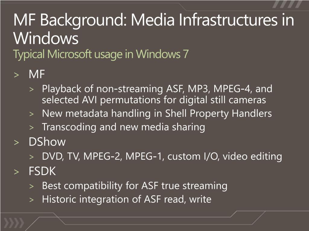 MF Background: Media Infrastructures in WindowsTypical Microsoft usage in Windows 7 • MF • Playback of non-streaming ASF, MP3, MPEG-4, and selected AVI permutations for digital still cameras • New metadata handling in Shell Property Handlers • Transcoding and new media sharing • DShow • DVD, TV, MPEG-2, MPEG-1, custom I/O, video editing • FSDK • Best compatibility for ASF true streaming • Historic integration of ASF read, write