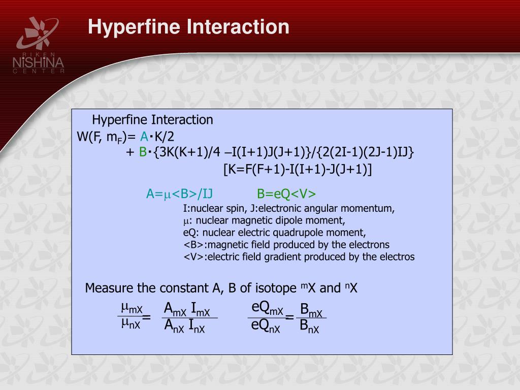 Hyperfine Interaction Hyperfine Interaction W(F, mF)= A・K/2 + B・{3K(K+1)/4 –I(I+1)J(J+1)}/{2(2I-1)(2J-1)IJ} [K=F(F+1)-I(I+1)-J(J+1)] A=m<B>/IJ B=eQ<V> I:nuclear spin, J:electronic angular momentum, m: nuclear magnetic dipole moment, eQ: nuclear electric quadrupole moment, <B>:magnetic field produced by the electrons <V>:electric field gradient produced by the electros Measure the constant A, B of isotope mX and nX mmX eQmX AmX ImX BmX = = mnX AnX InX eQnX BnX